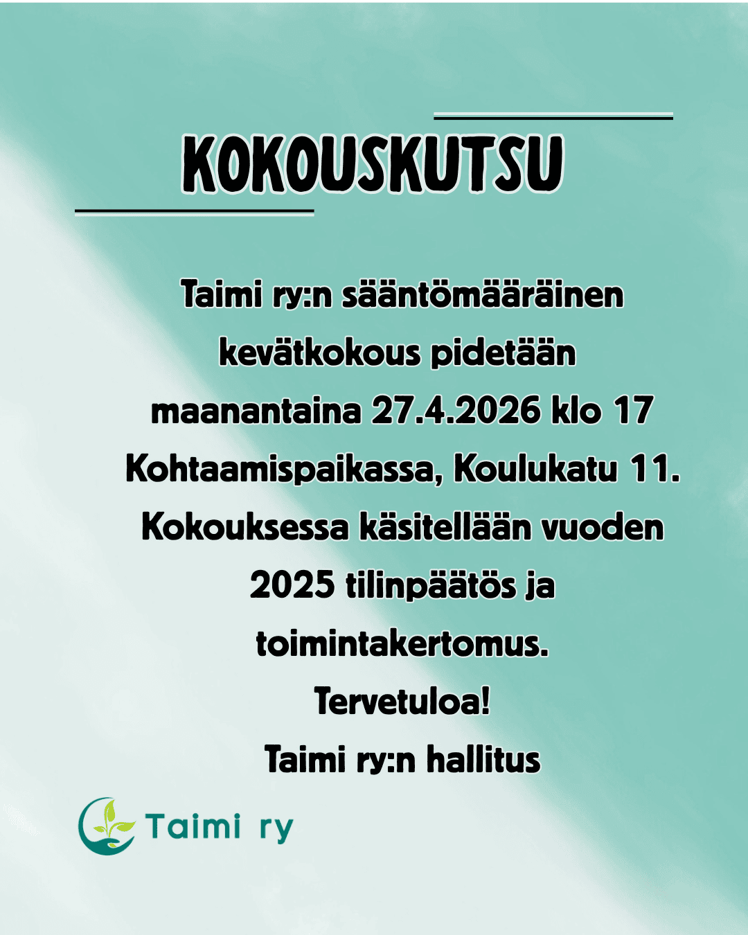 Taimi ry:n jäsenenä pääset vaikuttamaan ja tuet samalla yhdistyksen toimintaa. Jäsenenä sinulla on myös mahdollista saada Mielenterveyden keskusliiton tarjoamia etuja. Katso tarkemmat tiedot MTKL: sivulta. Jäsenyyden hinta: 12€ / vuosi. Ainaisjäsenyys 120€.